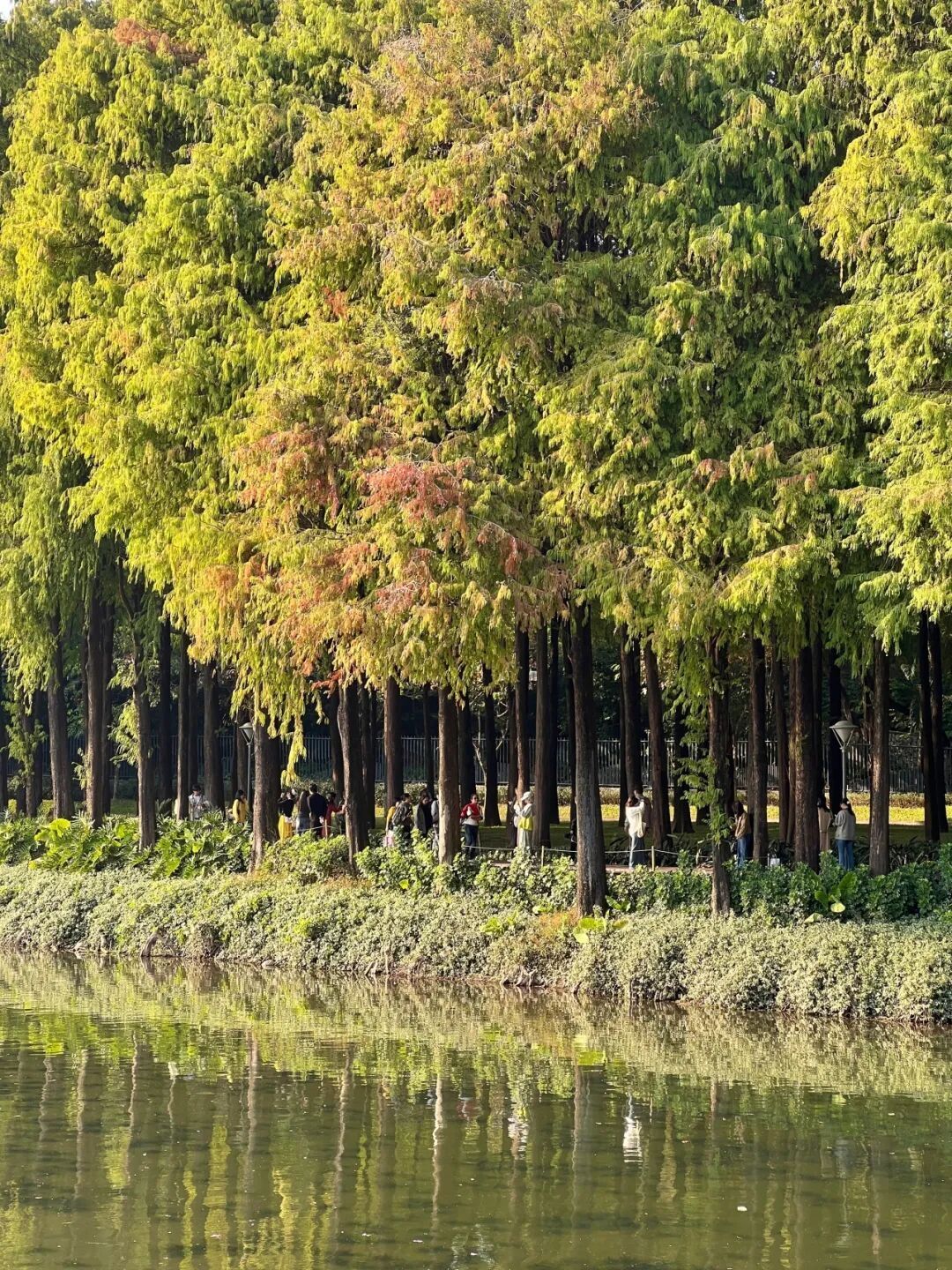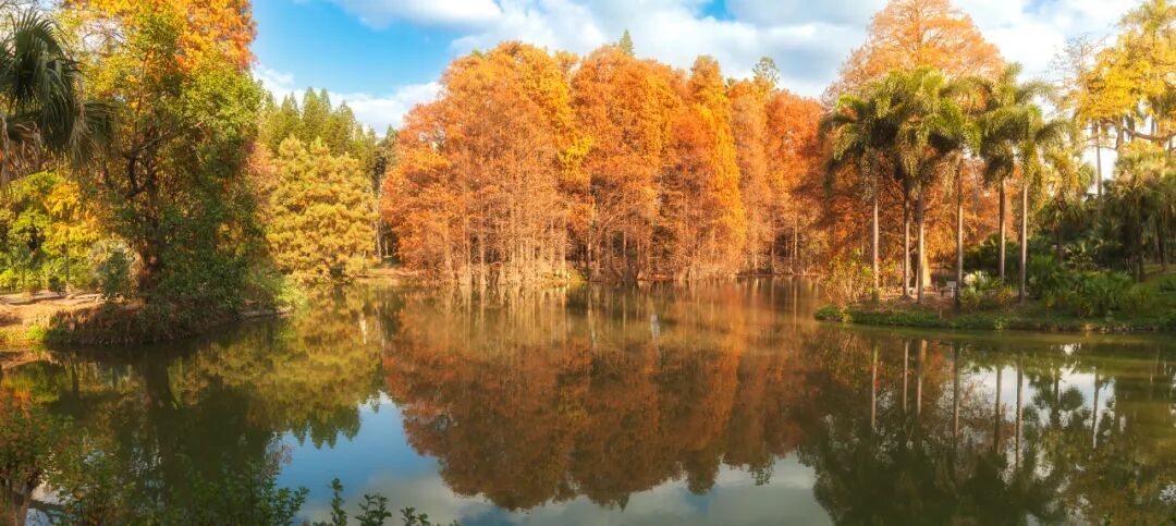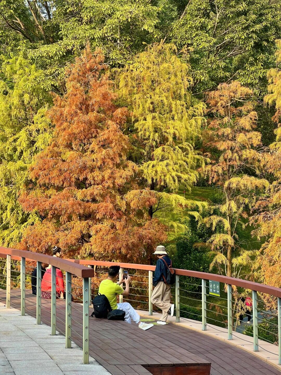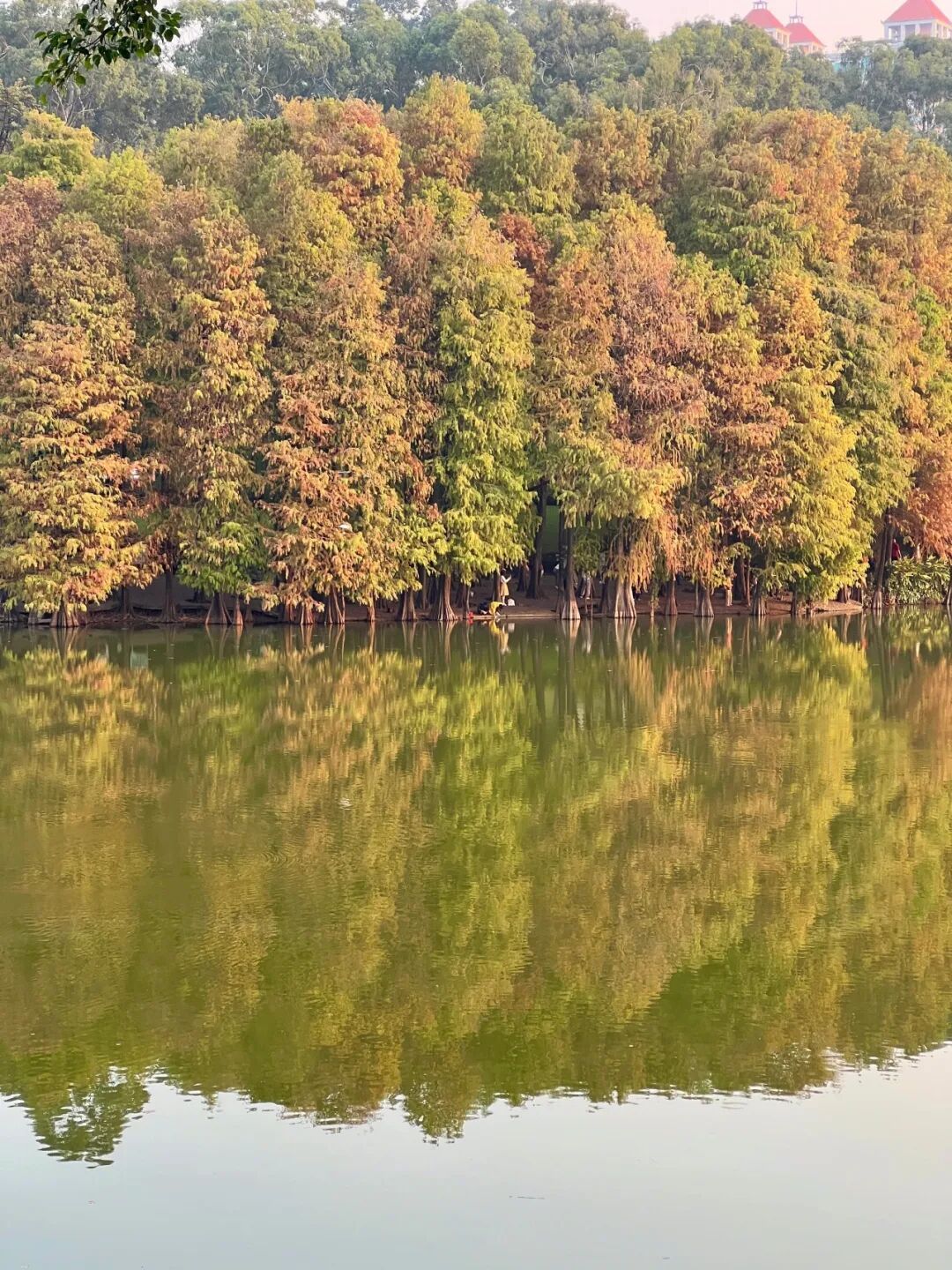 广州番禺医师山丛林公园里,落羽杉也正在演出“暖冬脚色秀”,由翠绿逐步调整为金黄、橙红。