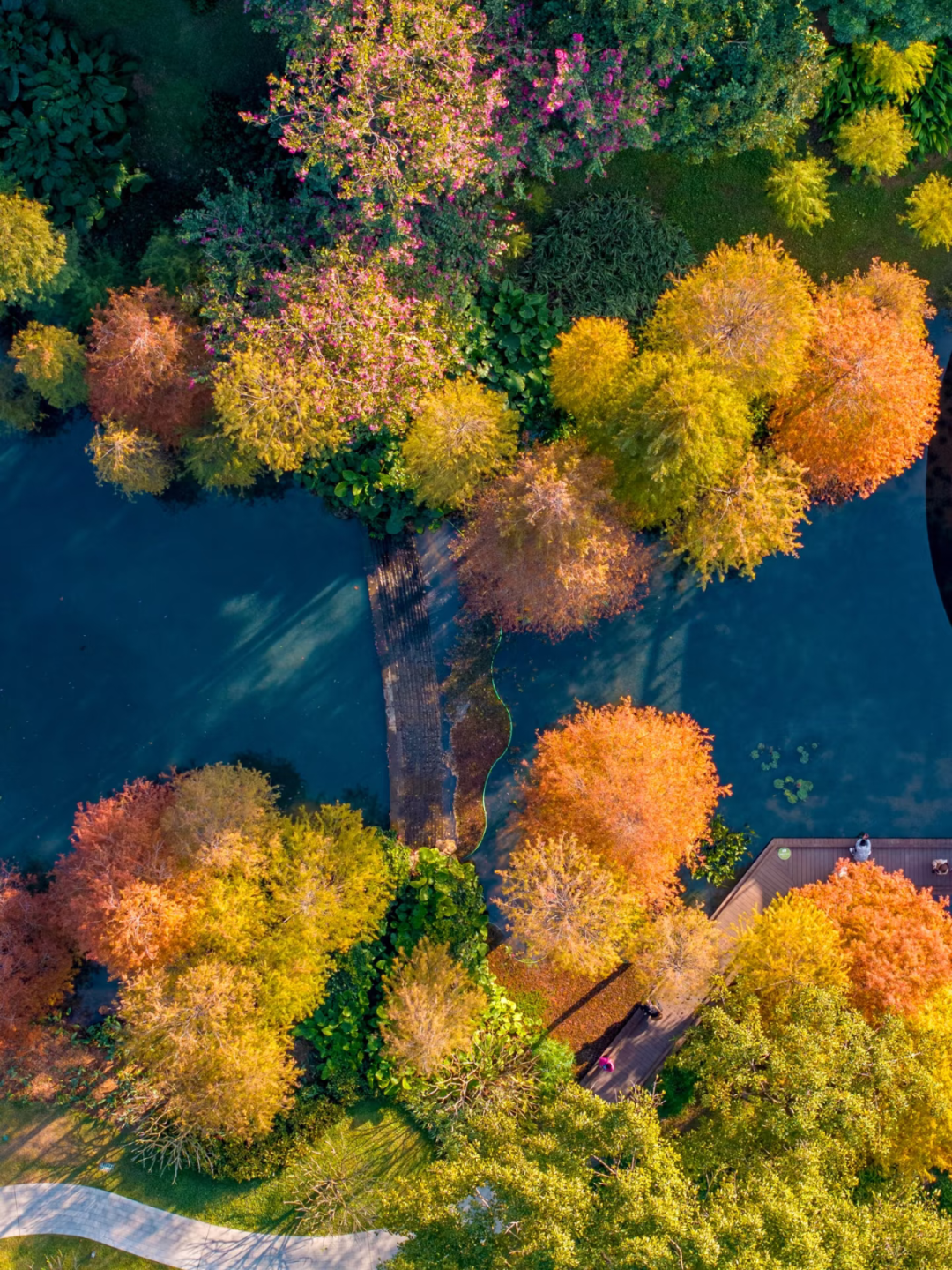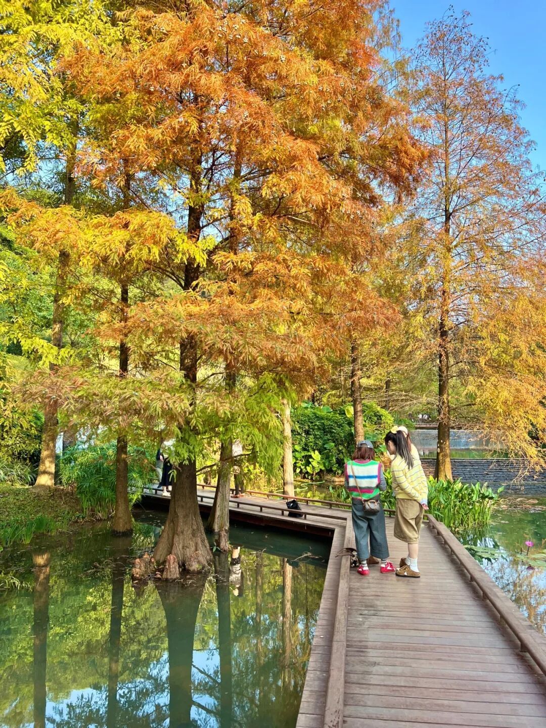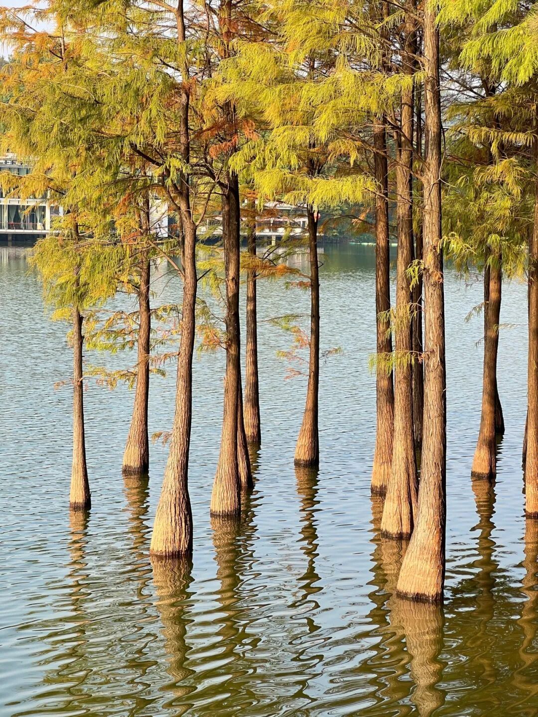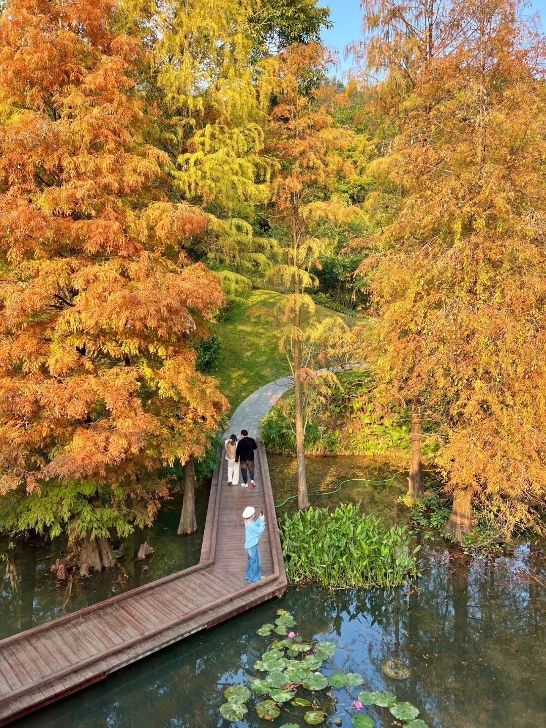 广州番禺医师山丛林公园里,落羽杉也正在演出“暖冬脚色秀”,由翠绿逐步调整为金黄、橙红。