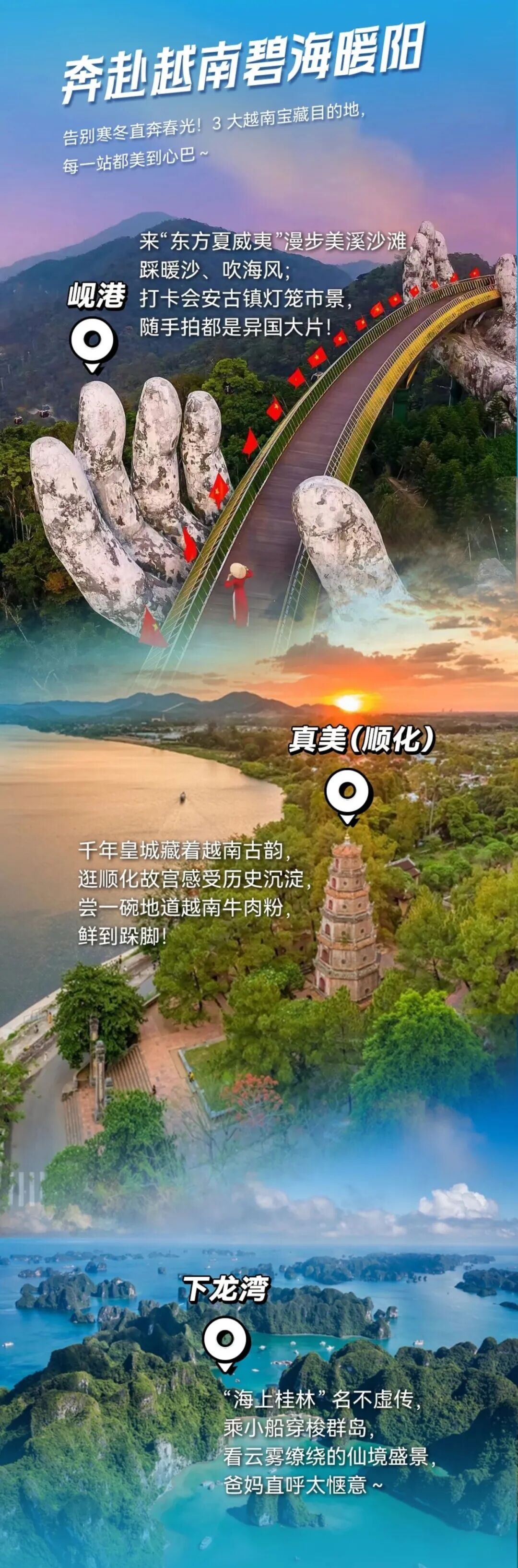 除了约略的香港周末之旅,更以5天4晚及6天5晚的越南航路为主,指示客东说念主探访岘港、下龙湾、顺化等热点目标地。