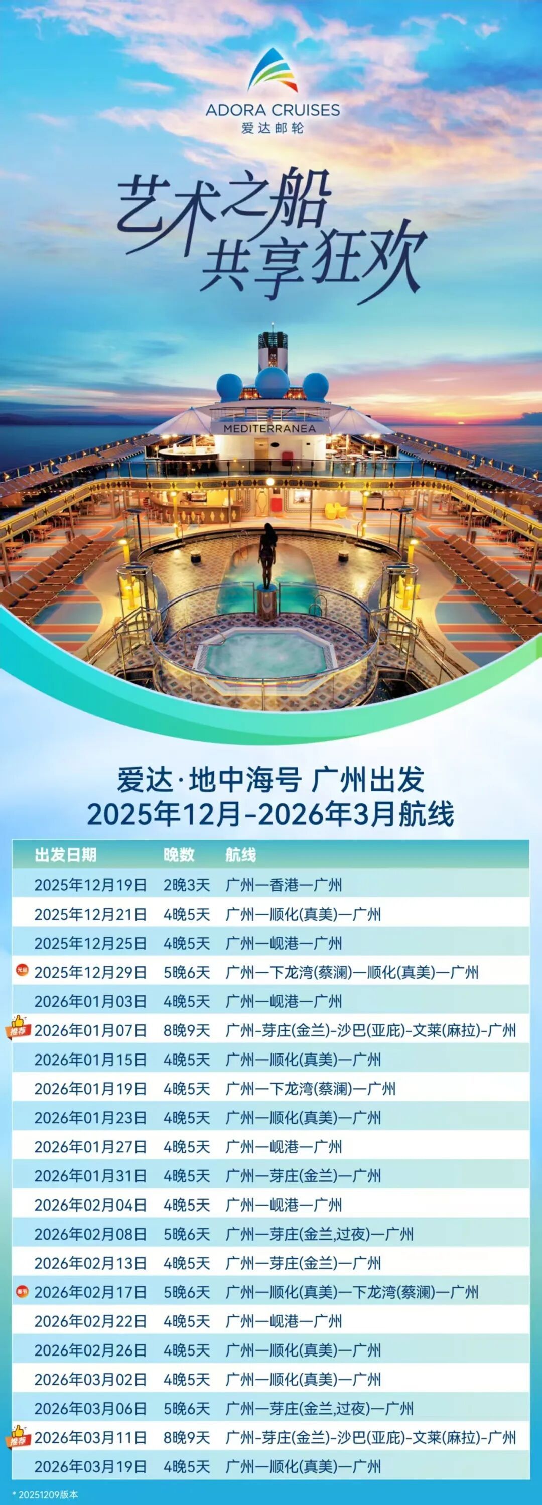 自12月7日起,爱达·地中海号已得当开启广州航季,将运营27个从广州起程的外洋邮轮航次,全面障翳圣诞、元旦、春节、元宵及“五一”等多个弥留假期。
